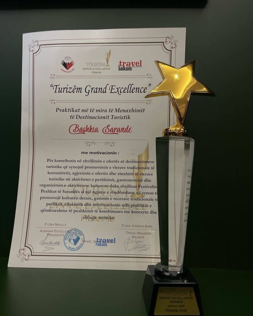 “Për kontributin në zhvillimin e ofertës së destinacioneve turistike që synojnë promovimin e vlerave tradicionale të komunitetit, zgjerimin e ofertës të zinxhirit të vlerave turistike në aktivitetet e peshkimit, gastronimisë dhe organizimin e aktiviteteve kulturore duke zhvilluar Festivalin e Peshkut të Sarandës si një ngjarje e rëndësishme që synon të promovojë kulturën detare, gatimin e recetave tradicione të peshkut, edukimin dhe informacionin mbi praktikat e qëndrueshme të peshkimit të kombinuara me koncerte dhe shfaqje artistike”.