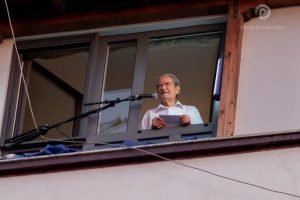 Kreu i Partisë Demokratike, Sali Berisha, në komunikim me qytetarët nga banesa ku qëndron në…