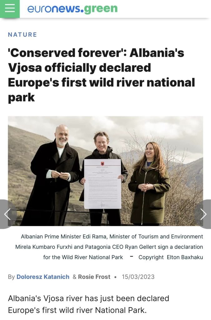Në 13 qershor 2022 u nënshkrua Memorandumi i Mirëkuptimit ndërmjet Ministrisë së Turizmit dhe Mjedisit dhe organizatës amerikane “Patagonia” për nisjen e punës së përbashkët për ta shpallur Vjosën “Park Kombëtar”.