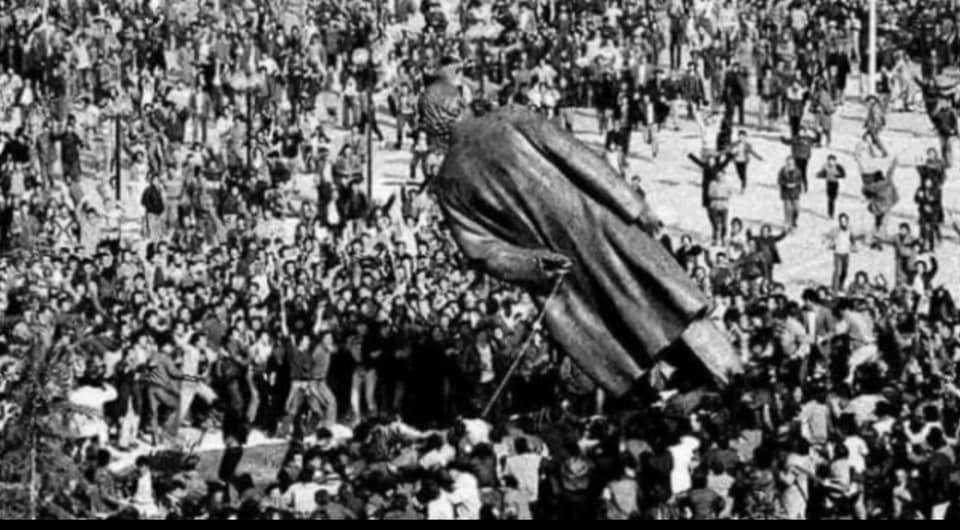 Fotoja poshtë, pak çaste me pas, kur edhe u shemb shtatoja e diktatorit Enver Hoxha.