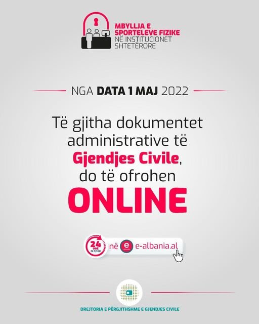 Nga data 1 maj të gjitha dokumentet e Gjendjes Civile do të ofrohen online në e-Albania.