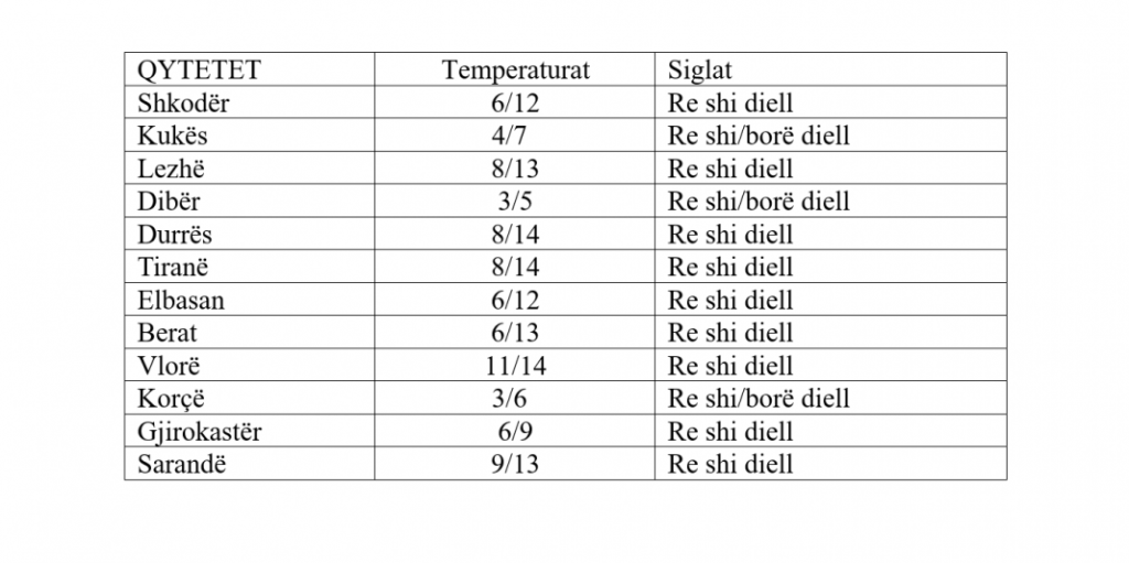 Pas orëve të mesditës priten reshje shiu të dobëta dhe lokale kryesisht përgjatë relieveve malore të vendit. Në zonën e Alpeve, verilindje mbi 700-800 metër dhe juglindje në lartësitë mbi 800-900 metër, priten reshje dëbore me intensitet të ulët dhe lokalisht mesatar. Shikimi i reduktuar nga prezenca e reshjeve të shiut dhe dëborës.