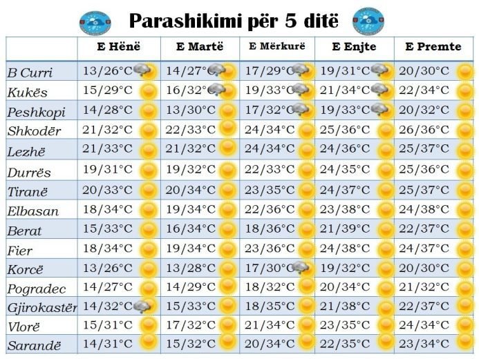 Për javën që presim përpara vendi ynë do të ndikohet nga kushte të qëndrueshme atmosferike. Por në ndryshim me ditët që kemi kaluar deri më tani; në fund të javës që presim përpara parashikohet që vendi ynë të preket nga vala e të nxehtit afrikan dhe temperatura shumë të larta.