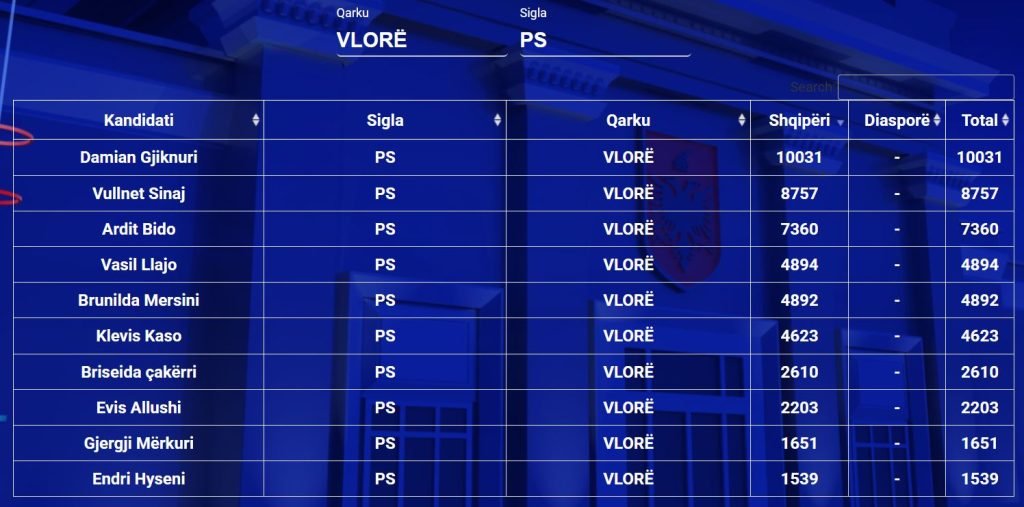 Në Qarkun e Vlorës ka përfunduar numërimi i votave preferenciale për kandidatët, ndërkohë që vijon vetëm numërimi i votës së diasporës. Nga ky qark, PS e cila ka marrë 9 mandate në total, fut në Kuvend 5 deputetë nga lista e hapur (4 burra dhe 1 grua). I pari më i votuari është Damian Gjiknuri me 10.031 vota, i ndjekur nga Vullnet Sinaj me 8757 vota. I treti më i votuari në këtë qark është edhe Ardit Biodo, një prej figurave më të spikatura që Rama përzgjodhi si kandidat për deputet, i cili ka arritur që të sigurojë mandat edhe pse ishte në listë të hapur. Ndërkohë, është duke u pritur numërimi i votës së diasporës për të parë nëse Vasil Llajo do të ruajë karrigen në Parlament apo do të jetë Klevis Kaso.