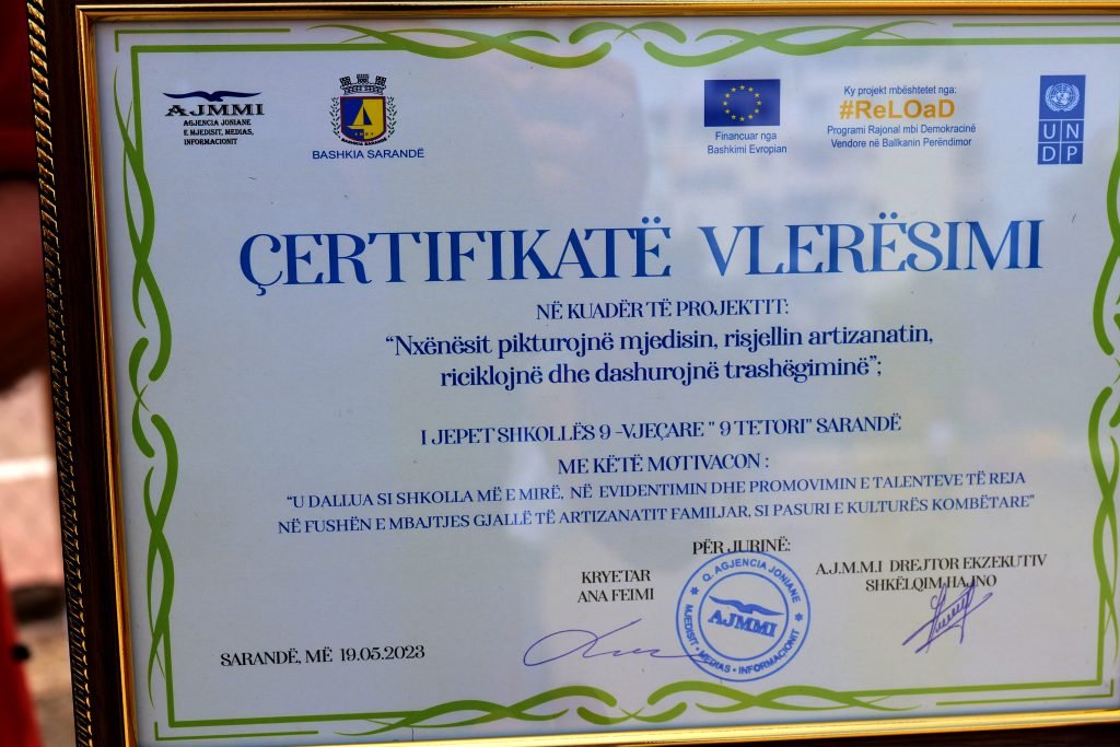 Në fokus të projektit me titull:” “Nxënësit, pikturojnë mjedisin, risjellin artizanati,; riciklojnë dhe dashurojnë trashëgiminë”, realizuar nga Qendra Agjencia AJMMI në kuadër të Programit Rajonal për Demokracinë Vendore në Ballkanin Perëndimor 2 (ReLOaD2), financuar nga Bashkimi Evropian dhe zbatuar nga UNDP, së fundi, në pesë shkolla të Bashkisë Sarandë, u organizua cikli I ekspozitave “Monumente dhe Destinacione” .