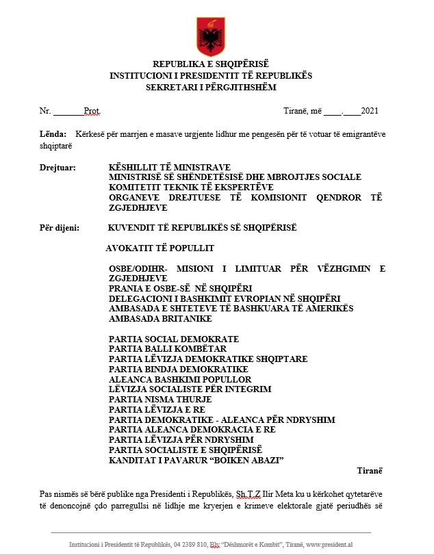 Institucioni i Presidentit të Republikës ka përcjellë peticionin e ardhur nga shoqatat e emigrantëve shqiptarë në Greqi, të cilët kundërshtojnë vendimin e Komitetit Teknik të Ekspertëve për vendosjen e një karantinë 2 javore për të gjithë emigrantët shqiptarë që vijnë nga Greqia dhe Maqedonia e Veriut.Në reagimin e shoqatës thuhet se ky vendim i Komitetit është bërë për ndaluar shqiptarët që në 25 prill të vijnë dhe të votojnë, pasi këto janë dy vendet që ata e kanë më të lehtë të vijnë për të votuar.