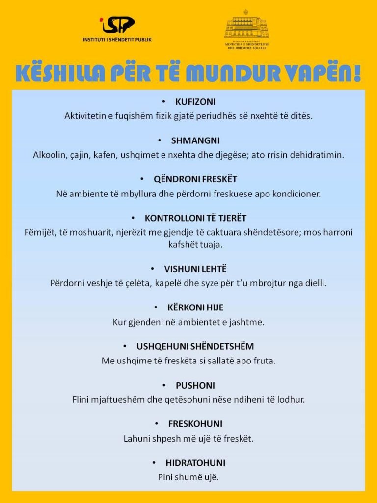 E ndërsa të gjithë përpiqemi t’i ‘shpëtojmë’ këtij të nxehti, Instituti i Shëndetit Publik ka publikuar disa këshilla të vlefshme se si të mbrohemi.Sipas ISHP, është e rëndësishme të qëndrojmë freskët, në ambiente të mbyllura dhe të përdorim freskuese apo kondicioner, të shmangim pijet e nxehta, si çaj apo kafe, e po ashtu edhe alkoolin, pasi rrisin dehidratimin.Po ashtu, ekspertët këshillojnë ushqime të shëndetshme dhe të freskëta si sallatë apo fruta si dhe rekomandohet pushim dhe shmangie të aktivitetit fizik.