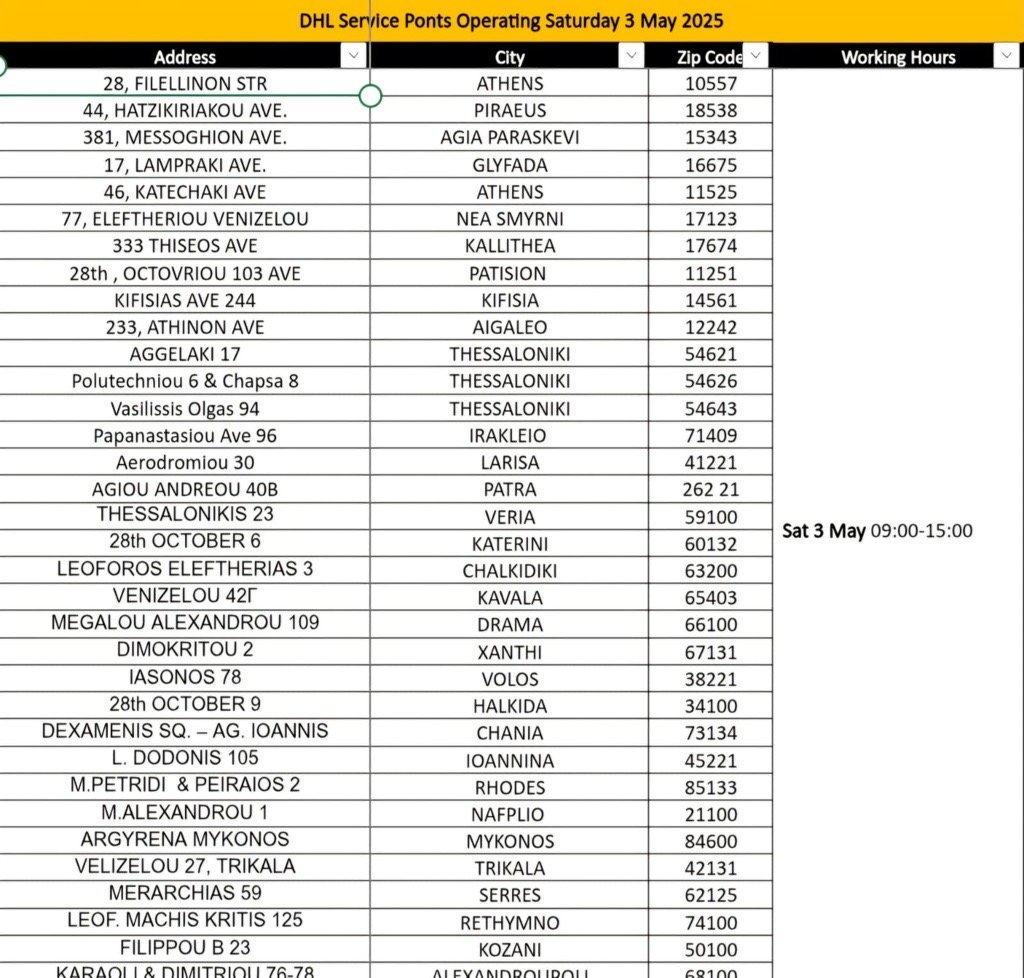 “Në listën e shfaqur keni pikat e DHL të hapura sot në mbarë Greqinë dhe orarin e punës së tyre për datën 3 Maj 2025”, deklaron Celibashi krahas listës së publikuar në rrjetet sociale.